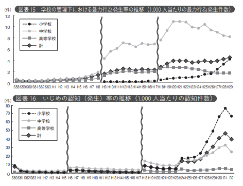 ですから、上掲のグラフが示しているのは、学校環境が年を追うごとにホワイト志向&高コンプライアンス志向になり、、かつては大人たちに見過ごされて認知の対象にならなかったより小さな暴力やいじめまでもが摘発や矯正の対象となったことを示しています。